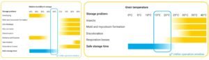 Grain chilling involves reducing the temperature of stored grain to below 20°C, rendering insects and their eggs inactive and halting the respiration process. It is a proactive preservation method that maintains grain quality and quantity over time. It eliminates the risk of infestation, development of molds and mycotoxins, starch loss and mass loss, discoloration of grain and moisture loss of grains as well.