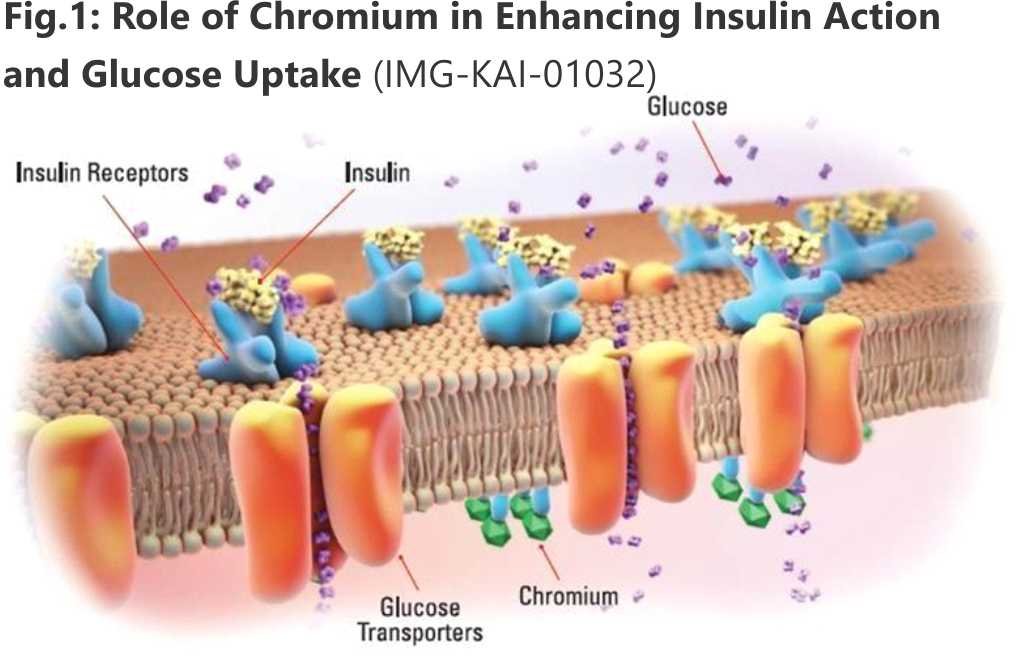 Chromium, a vital trace mineral, enhances insulin action and regulates glucose metabolism. Under stress, corticosterone levels rise, leading to hyperglycemia and inefficient glucose utilization. Chromium supplementation improves insulin sensitivity, stabilizes blood glucose, and reduces oxidative stress by boosting antioxidant enzyme activity. Figure 1 illustrates the role of chromium in enhancing insulin action and glucose uptake at the cellular level.