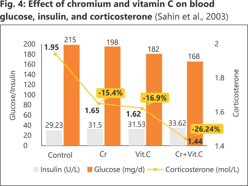 Supplementation through feed with chromium in combination with vitamin C demonstrates a positive metabolic shift in birds under stress conditions (Fig. 4). The combination helps maintain stable insulin levels, supports improved glucose utilization (with a reduction in circulating glucose compared to the control), and significantly lowers corticosterone levels (around a 26% reduction vs. the control) (Sahin et al., 2003).