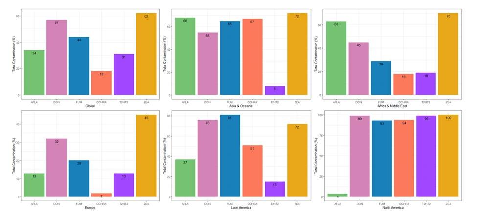 The most-detected mycotoxins included Deoxynivalenol (DON) and Zearalenone (ZEN), which were present in 57% and 62% of global samples, respectively. Dr. Swamy Haladi, global category manager for mould and mycotoxin risk management at Trouw Nutrition noted that it is unclear why the prevalence of ZEN is increasing. The increase could be a response to changes in climate and weather or an ongoing ingredient management issue. “In the last couple of years, there’s been a significant increase in ZEN contamination,